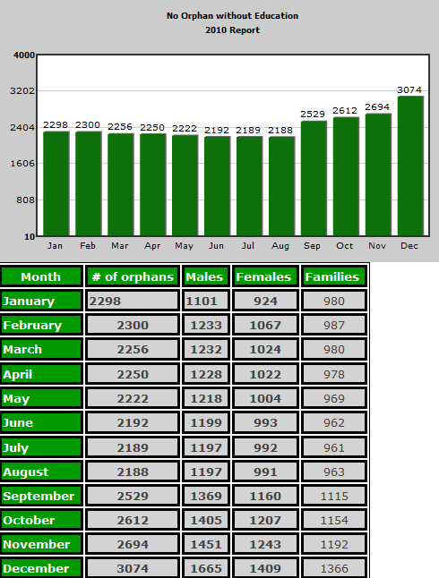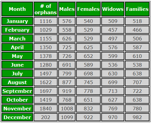 1,303 Orphans and 542 widowed Mothers / Guardians are currently receiving stipends every month from $33 to $84 depending on family size.