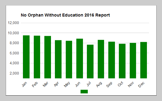 The following graph indicates the number of orphans supported each month by Hidaya in 2016.