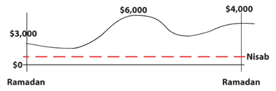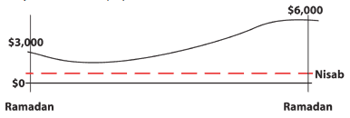 In this graph, $3,000 is the amount of wealth owned in Ramadan. This amount exceeds nisab (calculated according to the nisab of silver.) During the year it decreases but does not go below nisab. In this case, Ramadan will be counted as the beginning of the relevant lunar year and Zakat will be due on the amount of wealth in possession during next Ramadan, which is $6,000.