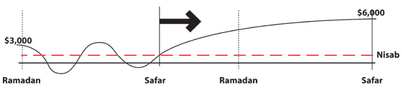 In this graph, $3,000 is the amount of wealth owned in Ramadan, which exceeds nisab. During the year it fluctuates – sometimes going below or above nisab. The individual’s relevant lunar year however only begins once the wealth goes above nisab in the month of Safar and remains above that for one complete year until next Safar. Hence, Zakat will be due in Safar on the complete amount, which is $6,000.