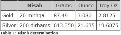 - An Ibada’h (worship) and not a tax, Obligatory on every Muslim who owns Nisab viz. 613.35 grams of silver, or 87.49 grams of gold or who owns one or more assets liable to Zakat as set out below, equal in value to 613.35 grams of silver or 87.49 grams of gold. . (See Sections 12.1 and 12.2 for more on Nisab).