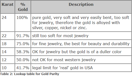 The value of gold content in jewelry depends on the gold’s purity, as well as its weight. Gold purity is measure on a scale of 1 to 24 karats (kts).