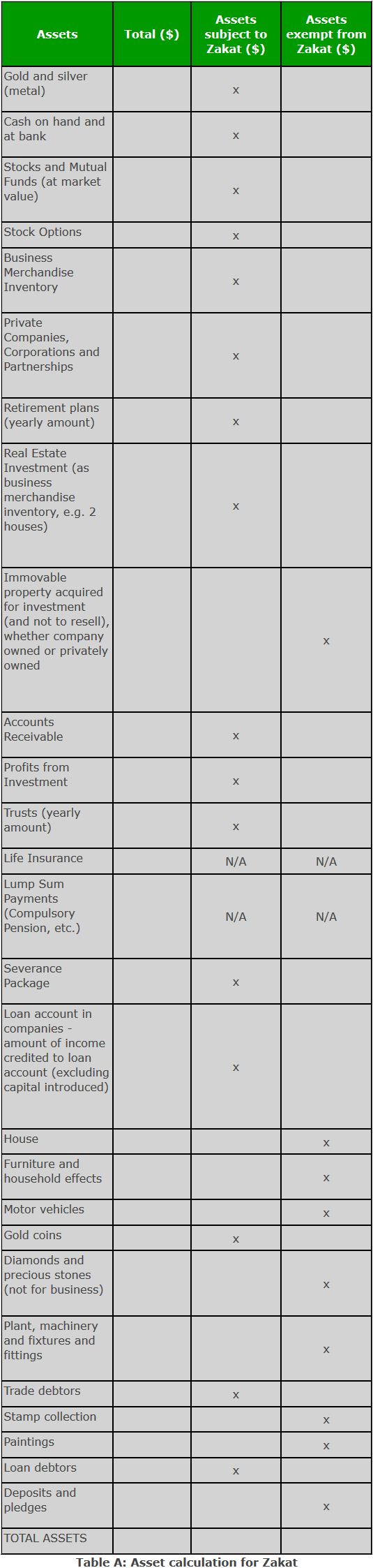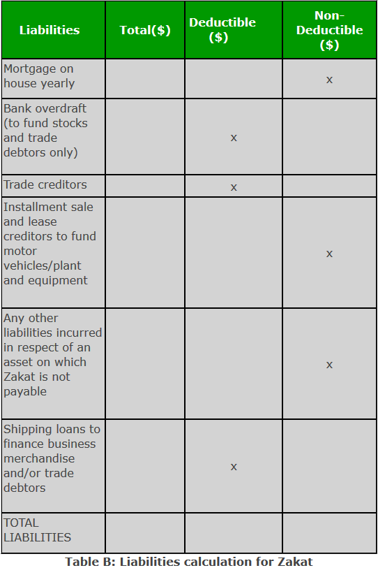 For a simpler calculation, kindly use this table. All these assets are Zakat-able, and the liabilities should include only those which are deductible (i.e. liabilities incurred due to assets that are Zakat-able, not on assets that are not Zakat-able). For example, the house you live in is non-Zakat-able so any mortgage payment on it is not deductible.
