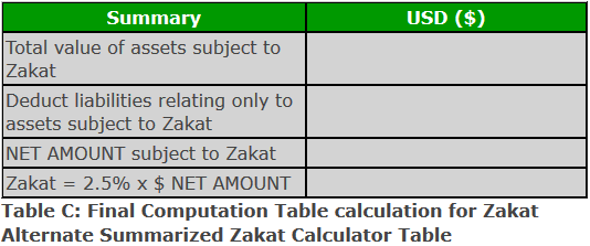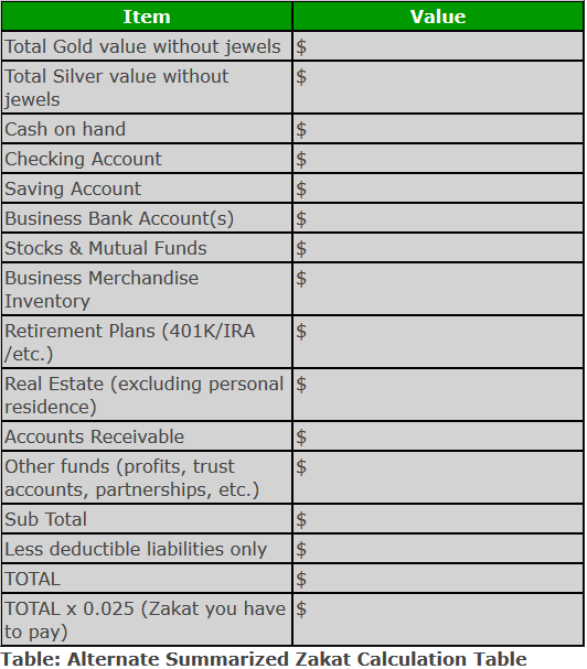 *Zakat is calculated according to the lunar year. Those who pay Zakat according to the solar year should accordingly, in order to take into account the difference in days, add 3% to the amount of Zakat payable.
