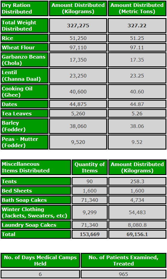 Since the beginning of the 2011 flood crisis in Pakistan, Hidaya has distributed a total of 396.43 tons (396,431.1 Kg) of relief supplies and has served 12,855 families (72,305 individuals) in over 200 villages of flood affected areas. To find out more details about the villages served, please click here.